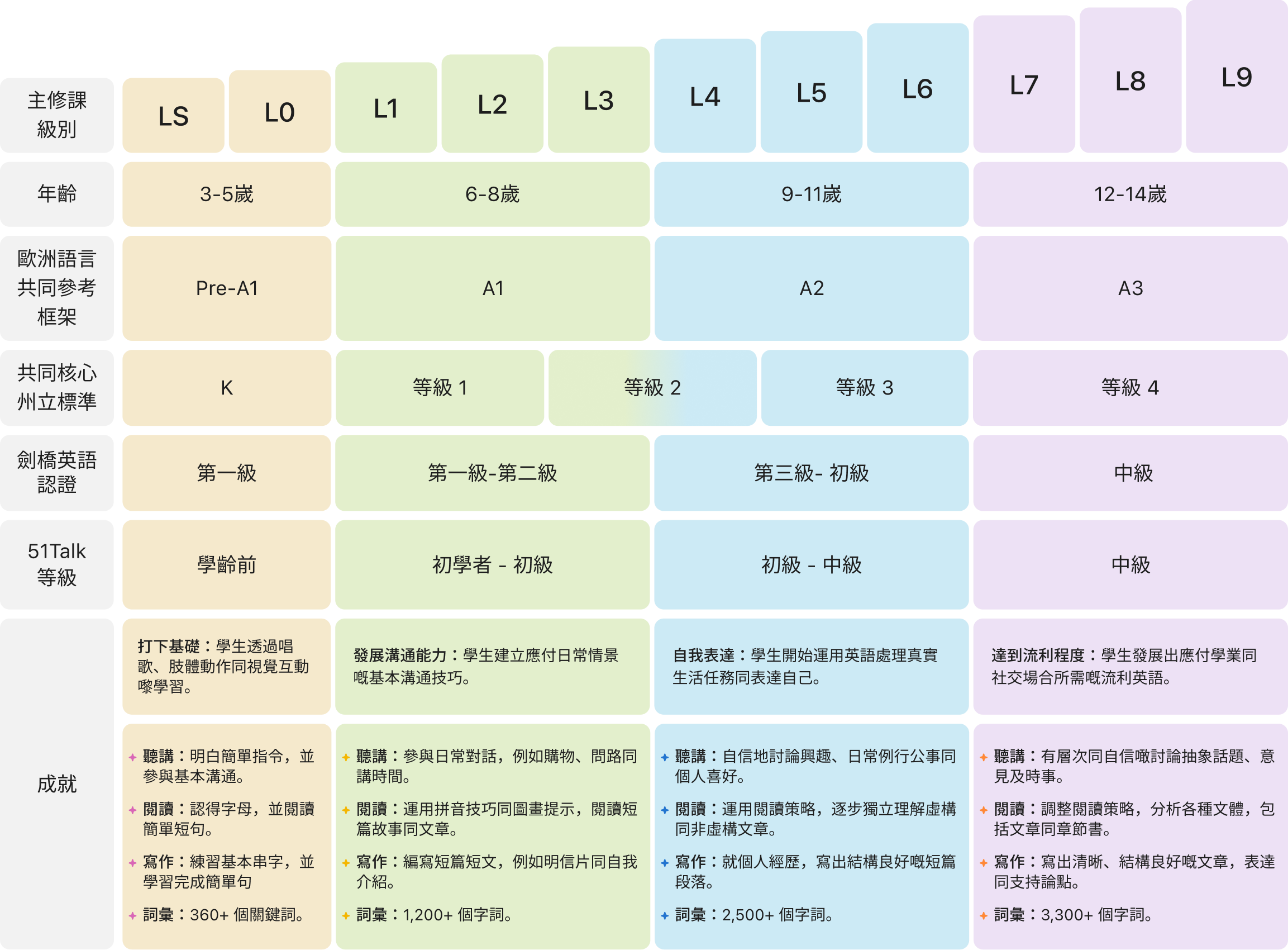 基於歐洲語言共同參考架構 (CEFR),並與劍橋兒童英語考試 (YLE) 和劍橋英語資格認證系統相銜接